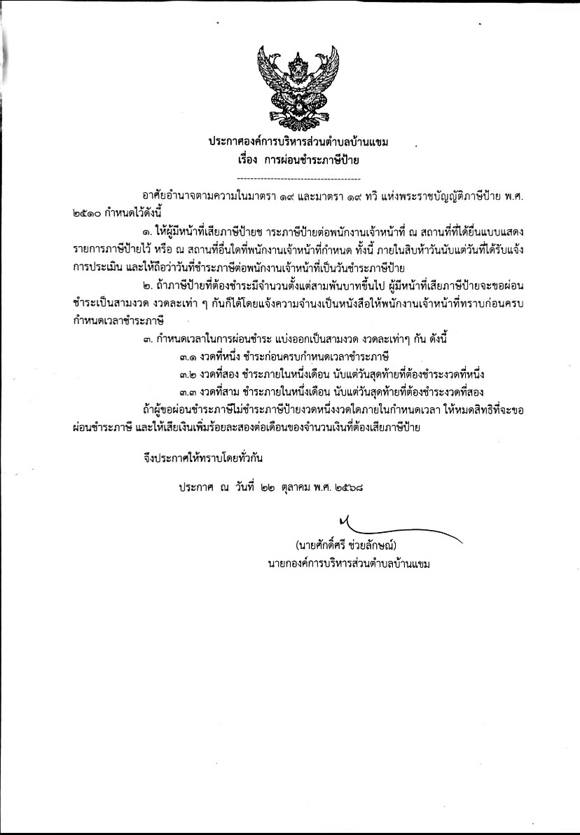 แจ้ง เรื่องการผ่อนชำระภาษีป้าย